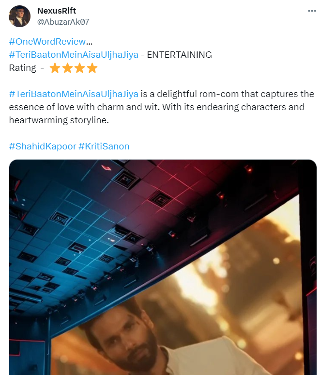 एक यूजर ने फोटो शेयर करते हुए लिखा- वन वर्ड रिव्यू ‘एंटरटेनिंग’ जिसके साथ फिल्म को 4 स्टार रेटिंग भी दी है| तेरी बातों में ऐसा उलझा जिया एक मजेदार राम कॉम है| जिसमें प्यार के चार्म के साथ दिमाग, और प्यार से भरे किरदार के साथ ही फिल्म की स्टोरी लाइन अच्छी है|