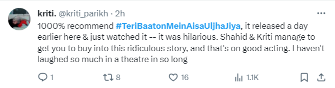 एक यूजर ने एक्स पर लिखा- तेरी बातों में ऐसा उलझा जिया एक बहुत अच्छी फैमिली एंटरटेनर फिल्म है | फिल्म आसानी से 150 करोड़ कमा लेगी| शाहिद कपूर सच में हीरा है वहीं कृति ने भी फिल्म में बहुत अच्छा काम किया है|