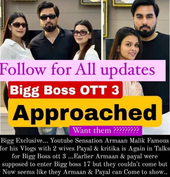 यूट्यूबर अरमान मलिक अपनी दो शादियों को लेकर अक्सर चर्चा में बने रहते हैं| कृतिका मलिक और पायल मलिक उनकी दो पत्नियां हैं| बिग बॉस के पहले के सीजन में भी उनके शामिल होने का नाम सामने आया लेकिन ऐसा हुआ नहीं| वहीं अब फिर कहा जा रहा है कि बॉस OTT 3 के लिए मेकर्स ने अरमान मलिक और उनकी पहली पत्नी पायल मलिक को अप्रोच किया है, हालांकि इस पर यूट्यूबर ने अभी तक कोई रिएक्ट नहीं किया है| बिग बॉस के फैन पेज ने ये जानकारी शेयर की है|
