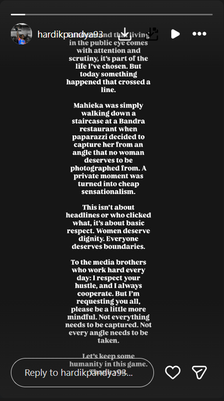 हार्दिक ने अपने आधिकारिक इंस्टाग्राम अकाउंट पर एक स्टोरी साझा की, जिसमें उन्होंने पैपराजी के बर्ताव पर कड़ी नाराजगी जताई। उन्होंने लिखा, “लोगों की नजरों में रहने के लिए ध्यान जरूरी है। यह उस लाइफ का हिस्सा है जिसे मैंने चुना है। लेकिन आज कुछ ऐसा हुआ जिसने हद पार कर दी।” हार्दिक ने बताया कि उनकी रूमर्ड गर्लफ्रेंड माहिका बांद्रा के एक रेस्टोरेंट से निकल रही थीं। वह सीढ़ियों से नीचे उतर रही थीं, तभी पैपराजी ने उन्हें ऐसे एंगल से शूट किया, जो किसी भी महिला के सम्मान के खिलाफ है।