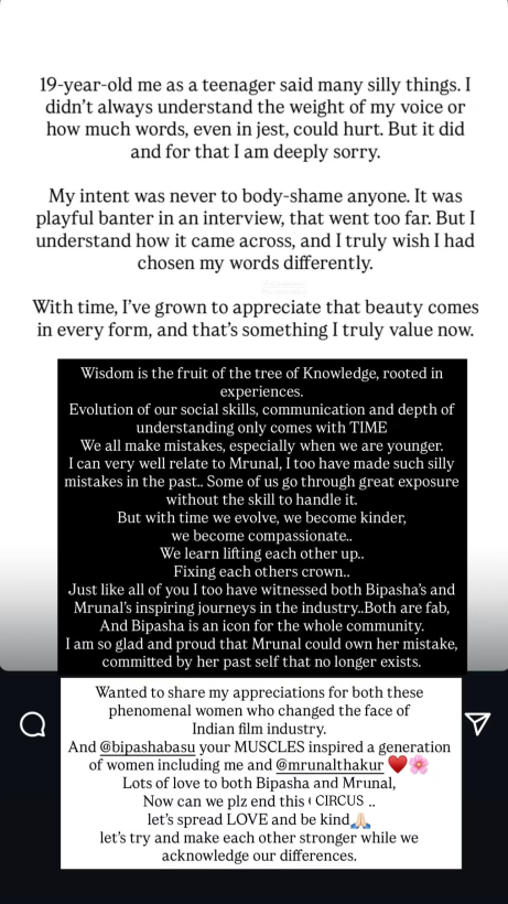 अपने पोस्ट में हिना ने बिपाशा बसु की भी खूब तारीफ की। उन्होंने लिखा कि बिपाशा पूरे समुदाय के लिए प्रेरणा हैं और मृणाल भी एक शानदार महिला हैं। हिना ने खुशी जताई कि मृणाल ने अपनी गलती मानकर माफी मांगने का साहस दिखाया, जो परिपक्वता और विनम्रता की निशानी है।