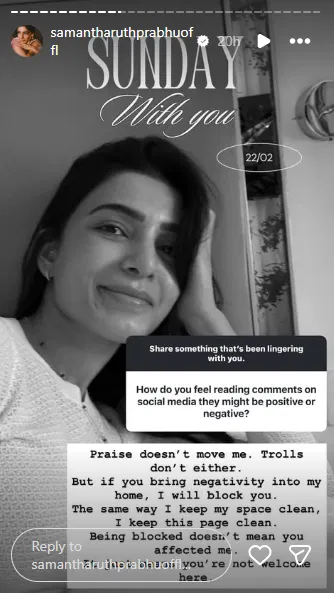 इंस्टाग्राम पर ‘Ask Me Anything’ सेशन के दौरान एक फैन ने उनसे पूछा कि वह सोशल मीडिया पर मिलने वाली तारीफ और नेगेटिव कमेंट्स को कैसे हैंडल करती हैं। इस पर समांथा ने बेबाक अंदाज में जवाब देते हुए कहा कि न तो तारीफ उन्हें प्रभावित करती है और न ही ट्रोल्स।