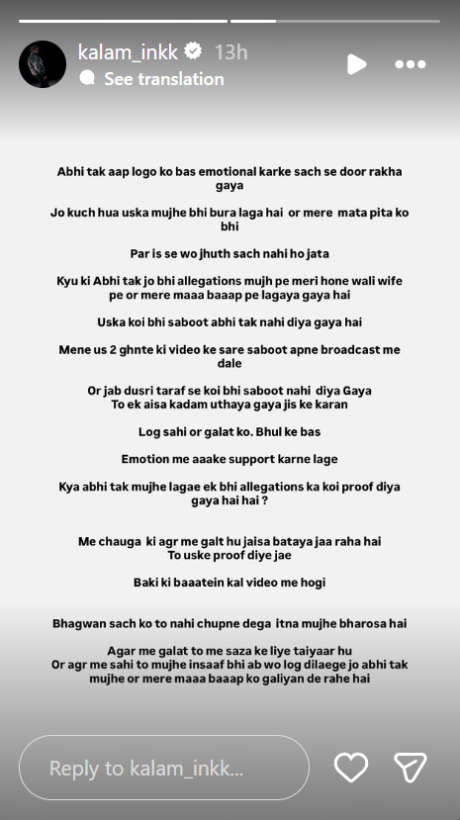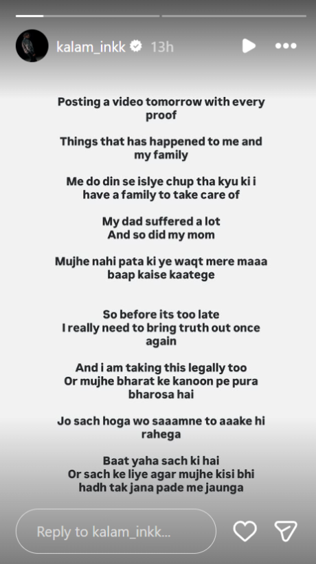 कलम इंक ने अपनी इंस्टाग्राम स्टोरी में लिखा कि वह जल्द ही एक वीडियो जारी करेंगे, जिसमें पूरे मामले से जुड़े सभी सबूत पेश किए जाएंगे। उन्होंने कहा कि पिछले दो दिनों से वह इसलिए चुप थे क्योंकि उन्हें अपने परिवार और माता-पिता की देखभाल करनी थी।