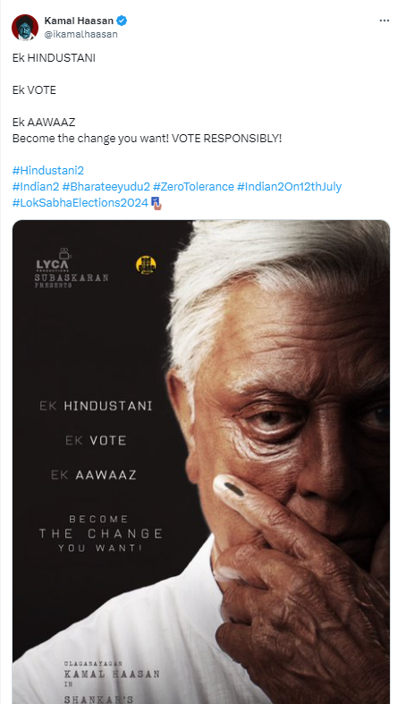 कमल हासन ने अपनी फिल्म हिंदुस्तानी 2 का पोस्टर शेयर करते हुए फैन्स से एक अपील की है एक्टर ने कहा कि लोग पोलिंग बूथ पर जाये और वोट करें|