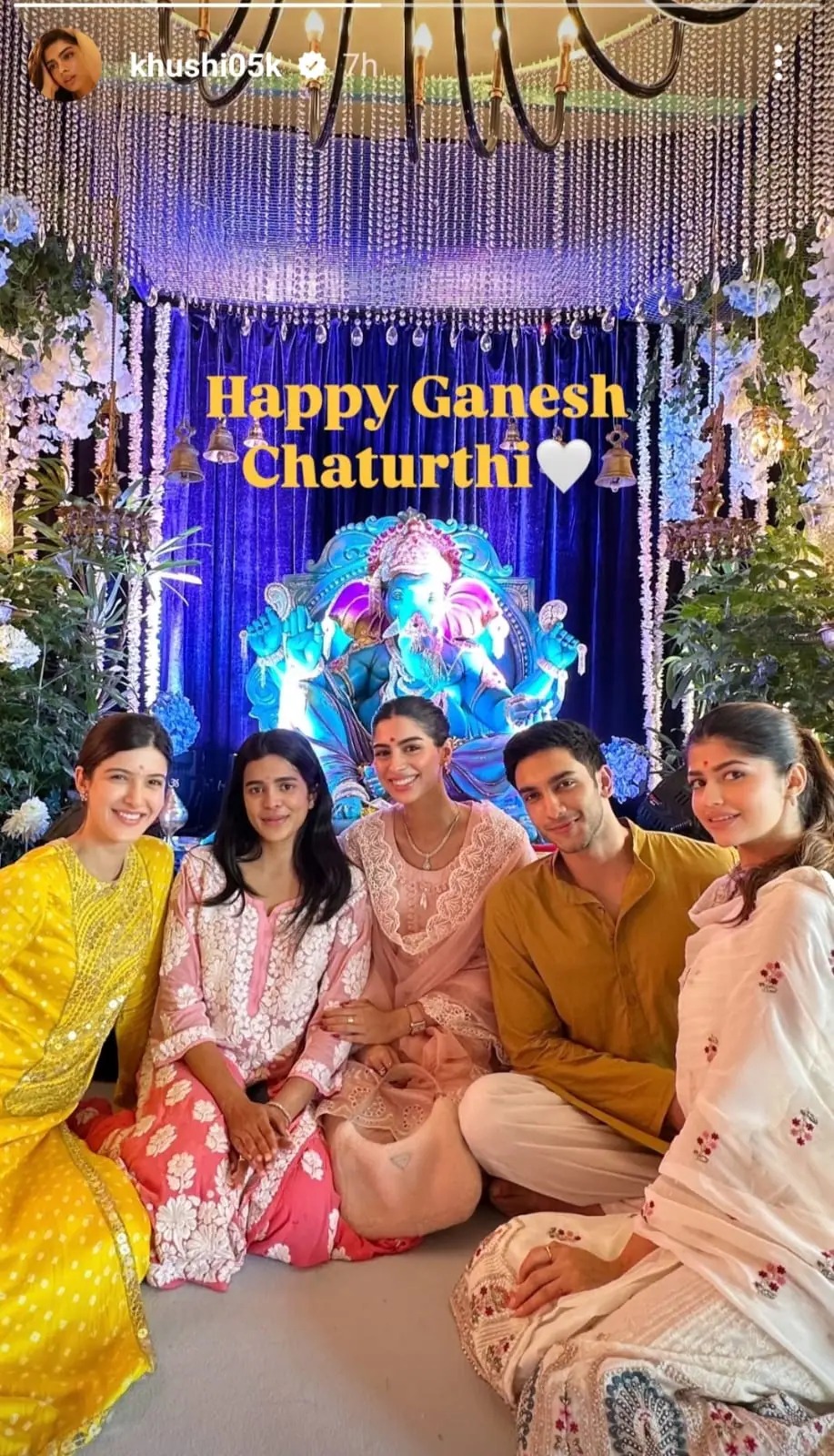 इस तस्वीर में खुशी कपूर और उनके दोस्तों का फेस्टिवल सेलिब्रेशन नजर आ रहा है। खुशी ने इस तस्वीर को इंस्टाग्राम पर शेयर करते हुए लिखा, ‘हैप्पी गणेश चतुर्थी’। फोटो में खुशी ने पीच कलर का खूबसूरत कुर्ता पहना हुआ है, जबकि वेदांग रैना मस्टर्ड कलर के कुर्ते में काफी हैंडसम नजर आ रहे हैं। उनके साथ इस फोटो में बेस्टफ्रेंड शनाया कपूर और वरुण धवन की भतीजी अंजिनी धवन भी दिखाई दे रही हैं। सभी के चेहरों पर गणपति उत्सव की खुशी साफ झलक रही है।