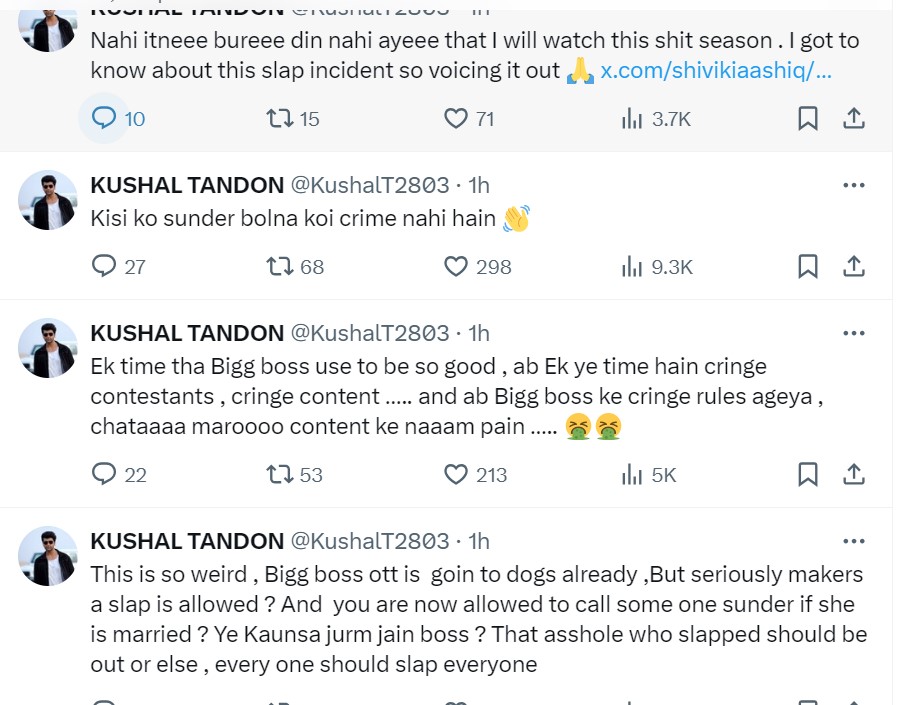 कुशाल टंडन ने सोशल मीडिया प्लेटफॉर्म एक्स पर पोस्ट के जरिये विशाल पांडे के समर्थन में अपनी बात रखी है| उन्होंने अपने पोस्ट में कहा कि यह बहुत अजीब है, बिग बॉस ओटीटी पहले से ही खराब चल रहा है लेकिन गंभीरता से निर्माताओं को थप्पड़ मारने की अनुमति है? और अब आपको किसी को सुंदर कहने की इजाजत नहीं है अगर वह शादीशुदा है? ये कौन सा जुर्म है बॉस? जिसने थप्पड़ मारा है, उसे बाहर कर देना चाहिए वरना, हर किसी को एक दूसरे को थप्पड़ मारना चाहिए|