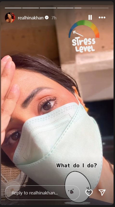 हिना खान ने अपने इंस्टाग्राम स्टेटस पर कई स्टोरीज शेयर कीं| एक्ट्रेस ने मास्क लगा कर अपनी तस्वीर शेयर की है| जिसमें उनकी आंखों में बिगड़ी तबीयत से हुई परेशानी की झलक देखने को मिल रही है| एक्ट्रेस ने इसके कैप्शन में लिखा,’स्ट्रेस लेवल, मैं क्या करूं |’