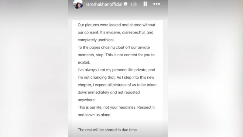 Ramsha Khan ने अपने पोस्ट में साफ तौर पर कहा—“ये हमारी जिंदगी है, कोई हेडलाइन नहीं। कृपया इसकी इज्जत करें और हमें अकेला छोड़ दें।” उनके इस बयान के बाद सोशल मीडिया पर भी बहस शुरू हो गई है, जहां कुछ लोग उनकी प्राइवेसी का समर्थन कर रहे हैं, तो कुछ इस खबर को लेकर उत्सुक नजर आ रहे हैं।