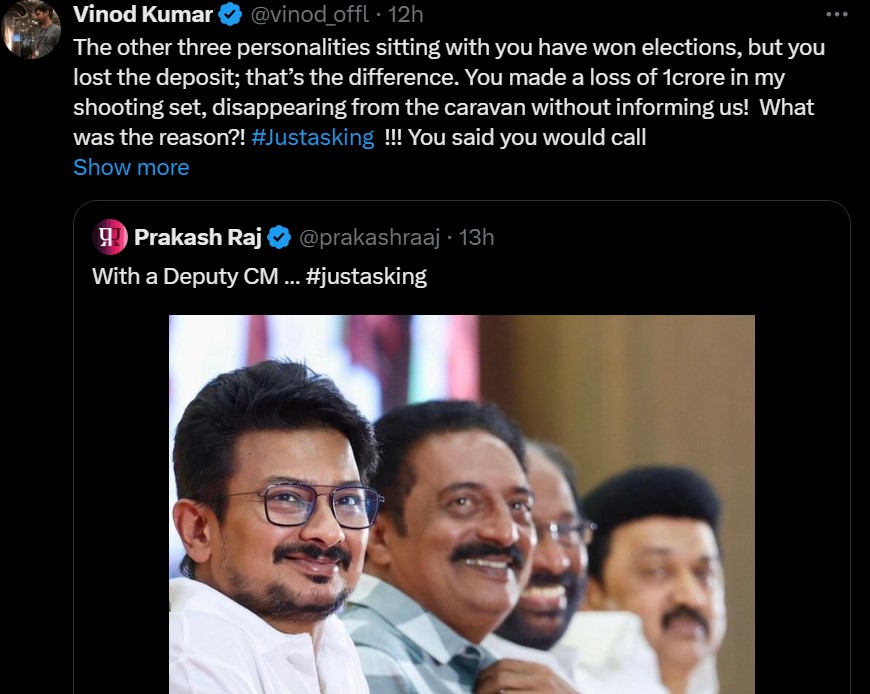 हाल ही में, प्रकाश राज ने सोशल मीडिया पर तमिलनाडु के डिप्टी चीफ मिनिस्टर उदयनिधि स्टालिन और उनके पिता, तमिलनाडु के मुख्यमंत्री एमके स्टालिन के साथ एक तस्वीर शेयर की। यह तस्वीर वायरल हो गई, और इस पर कई तरह के कमेंट्स भी आने लगे। लेकिन सबसे ज्यादा ध्यान खींचने वाला कमेंट फिल्ममेकर विनोद कुमार का था, जिसने इस पोस्ट को लेकर एक पुराने विवाद को फिर से हवा दे दी।