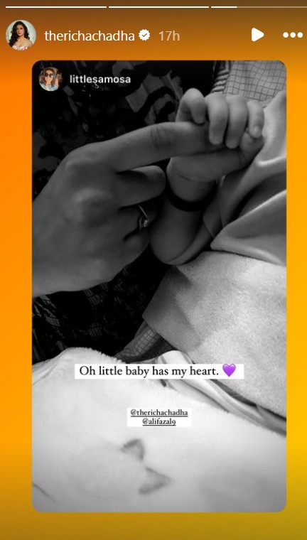 ऋचा ने अपनी बेटी की एक ब्लैक एंड व्हाइट तस्वीर शेयर की, जिसमें वह अपनी नन्ही परी का हाथ पकड़े हुए दिख रही हैं। यह तस्वीर जितनी प्यारी है, उतनी ही भावुक भी है। फैंस ने इस तस्वीर पर प्यार भरे कमेंट्स किए हैं और उनकी बेटी को आशीर्वाद दिया है। यह तस्वीर ऋचा की दोस्त ने साझा की थी, जिसे उन्होंने रीपोस्ट किया।