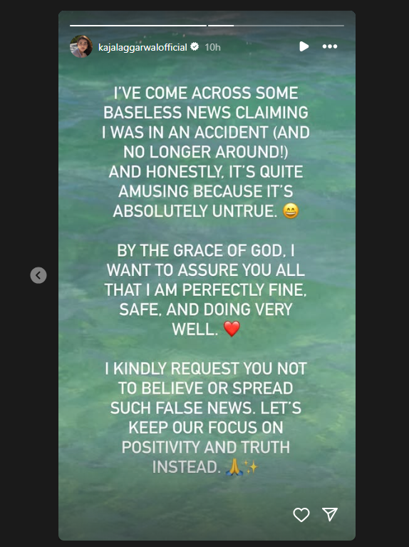 काजल अग्रवाल ने इंस्टाग्राम स्टोरी पर पोस्ट शेयर कर कहा, “मेरे बारे में कुछ झूठी खबरें फैलाई जा रही हैं कि मेरा एक्सीडेंट हुआ है और मैं अब इस दुनिया में नहीं हूं। सच कहूं तो यह सुनकर मुझे हंसी आई, क्योंकि यह बिल्कुल गलत है। भगवान की कृपा से मैं बिल्कुल ठीक हूं, सुरक्षित हूं और अच्छा कर रही हूं। आप सबसे अनुरोध है कि ऐसी अफवाहों पर विश्वास न करें और इन्हें आगे न बढ़ाएं। चलिए, सच और सकारात्मक चीजों पर ध्यान दें।”