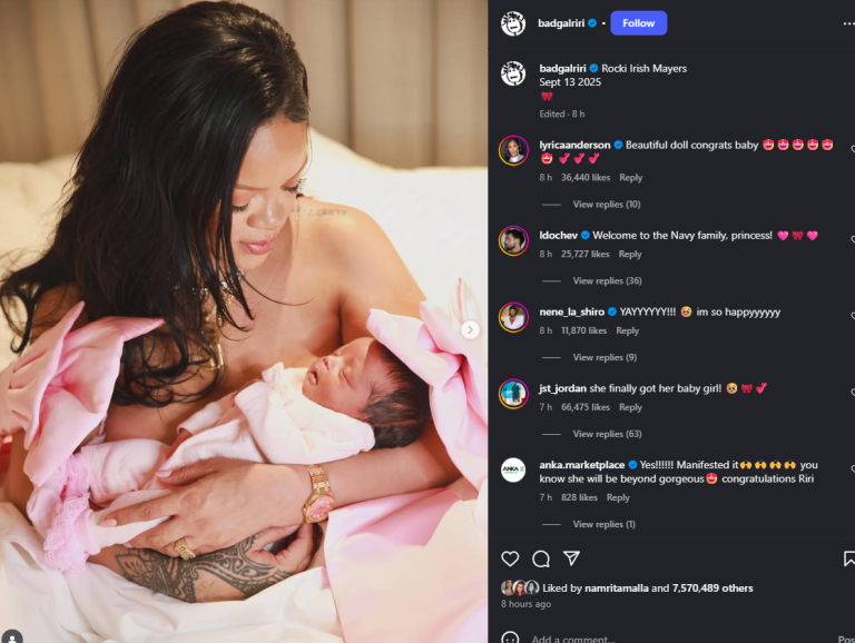 पहली तस्वीर में रिहाना अपनी बेटी को गुलाबी कंबल में लपेटे हुए प्यार से निहारती नजर आ रही हैं, जबकि दूसरी तस्वीर में छोटे-छोटे पिंक बॉक्सिंग ग्लव्स दिखाई दे रहे हैं। इस पोस्ट के कैप्शन में उन्होंने बेटी का नाम लिखा—”रॉकी आयरिश मेयर्स” और साथ ही एक पिंक बो इमोजी भी जोड़ा।