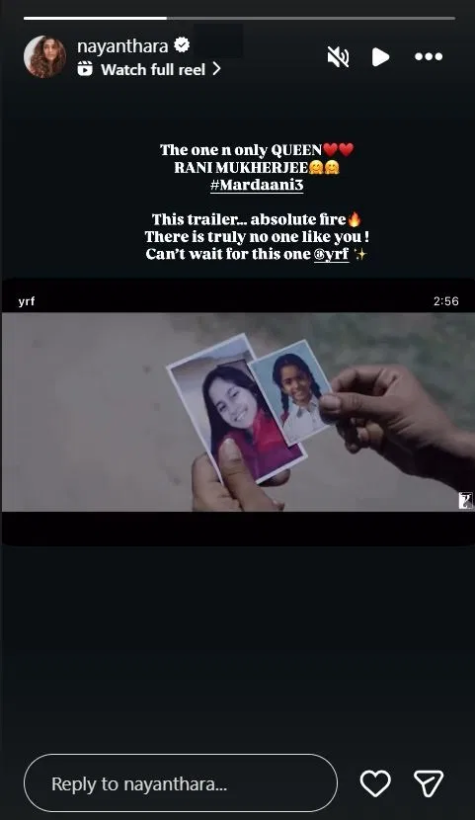 नयनतारा ने ‘मर्दानी 3’ का ट्रेलर देखने के बाद अपनी इंस्टाग्राम स्टोरी पर इसे शेयर किया और रानी मुखर्जी की खुलकर सराहना की। उन्होंने लिखा, “सिर्फ एक ही रानी है और वह है रानी मुखर्जी। यह ट्रेलर वाकई आग लगाने वाला है। आपकी तरह कोई नहीं है। मैं इस फिल्म का बेसब्री से इंतजार कर रही हूं।” इसके साथ उन्होंने दिल और फायर इमोजी भी लगाए, जो उनकी एक्साइटमेंट साफ जाहिर करते हैं।