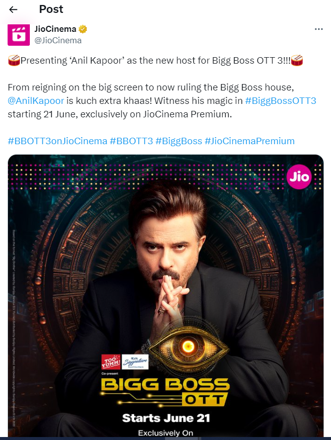 दिग्गज एक्टर अनिल कपूर ने सोशल मीडिया प्लेटफॉर्म इंस्टाग्राम पर बिग बॉस OTT 3 का एक पोस्टर शेयर किया, जिसमें एक्टर झक्कास अंदाज में नजर आ रहे हैं| पोस्टर में शो के रिलीज डेट का भी खुलासा किया गया है| उसमें लिखा है कि बिग बॉस 21 जून से जियोसिनेमा प्रीमियर पर आने वाला है| इस जानकारी के बाद तो दर्शक और भी ज्यादा उत्साहित हो गए हैं|