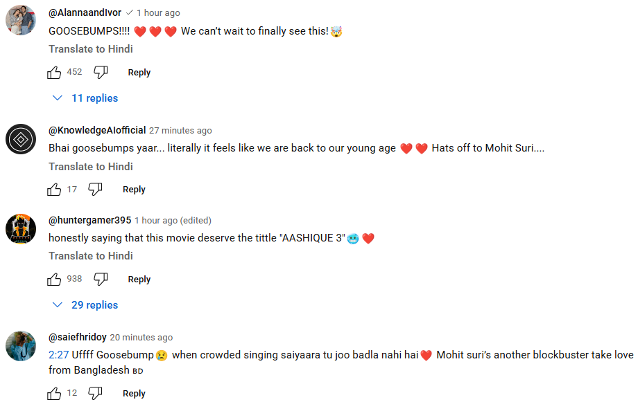 ‘सैयारा’ के ट्रेलर ने रिलीज होते ही सोशल मीडिया पर हलचल मचा दी है। सिर्फ एक घंटे में ट्रेलर को डेढ़ लाख से ज्यादा व्यूज मिल चुके हैं। एक यूजर ने लिखा, “ओह गॉड!!! क्या फिल्म है!!! YRF और मोहित सूरी ने फिर एक मास्टरपीस दे दिया है।” दूसरे ने कहा, “रोंगटे खड़े हो गए… ये फिल्म थिएटर में जरूर देखनी है।” तीसरे ने लिखा, “सैयारा टाइटल ट्रैक ने दिल छू लिया… लास्ट सीन में भीड़ के साथ गाना गाते हुए सीन ने झकझोर दिया।”
