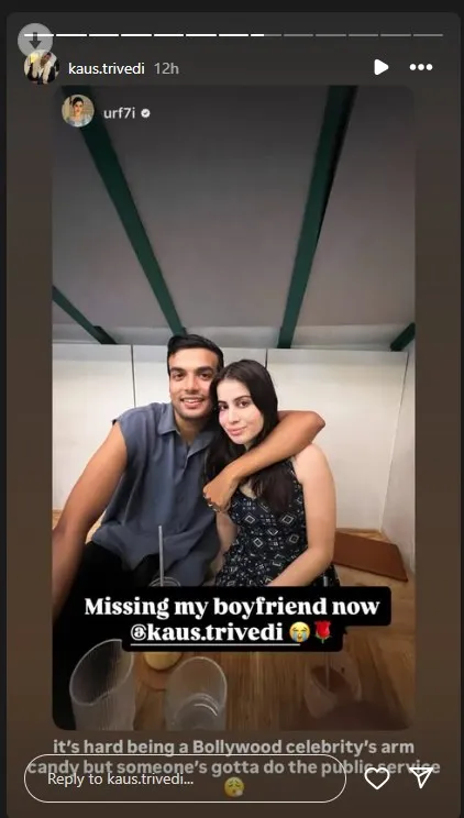 उर्फी ने जिस शख्स को टैग किया है उनका नाम कौस त्रिवेदी है। इसके साथ ही कौस ने भी सोशल मीडिया पर उर्फी संग कई तस्वीरें और स्टोरी शेयर कीं। उन्होंने उर्फी के पोस्ट को री-शेयर करते हुए मजाकिया अंदाज में लिखा, “बॉलीवुड सेलेब्रिटी का पसंदीदा बनना मुश्किल है, लेकिन किसी को तो पब्लिक सर्विस करनी ही होगी।”