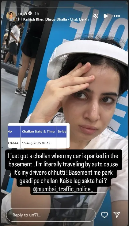 उर्फी जावेद ने इंस्टाग्राम स्टोरी पर जिम से अपनी एक तस्वीर साझा की, जिसमें वह हेडफोन लगाकर एक्सरसाइज कर रही थीं। इसी दौरान उन्हें चालान काटने की सूचना मिली। उन्होंने चालान की तस्वीर भी शेयर की, जिस पर 15 अगस्त की तारीख और सुबह 9:19 बजे का समय दर्ज था। यह देख एक्ट्रेस का मूड तुरंत खराब हो गया।