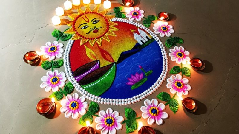 सूर्य देव को अर्घ्य या भोग लगाते हुए रंगोली