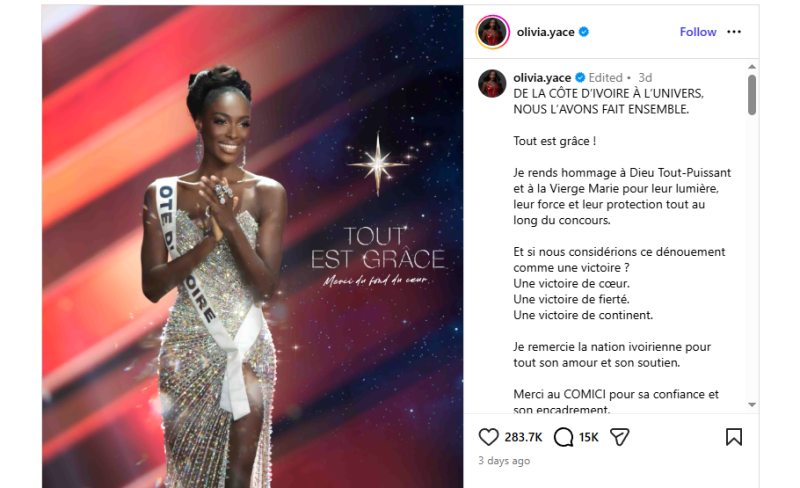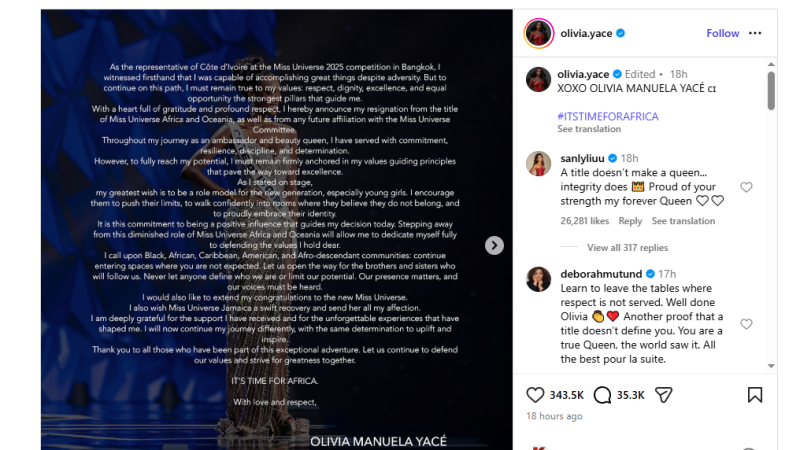 ओलिविया ने इंस्टाग्राम पर पोस्ट कर कहा कि यह रोल उनके मूल्यों और सिद्धांतों से मेल नहीं खाता। उन्होंने लिखा “मैं सम्मान, गरिमा और समान अवसरों में विश्वास करती हूं। इस पद में बने रहना मेरी पूरी क्षमता तक पहुंचने में बाधा डालता। दिल से आभार के साथ मैं मिस यूनिवर्स अफ्रीका और ओशिनिया के खिताब और मिस यूनिवर्स कमिटी से अपने सभी संबंध समाप्त करती हूं।”