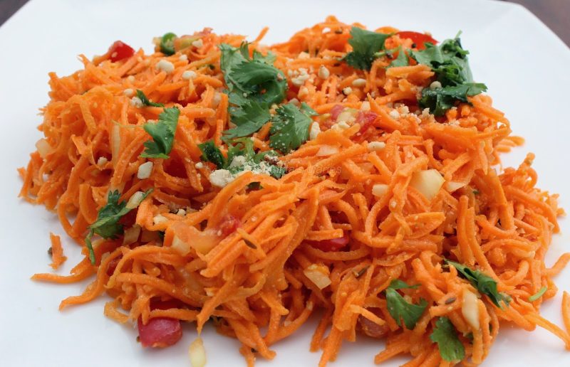 250 ग्राम कद्दूकस की हुई गाजर, 1 बारीक कटा प्याज, 1 बड़ा चम्मच भुनी मूंगफली का पाउडर, 1 बारीक कटी हरी मिर्च, स्वादानुसार नमक, चीनी, नींबू का रस, हरा धनिया, तेल, राई, हींग और करी पत्ते।