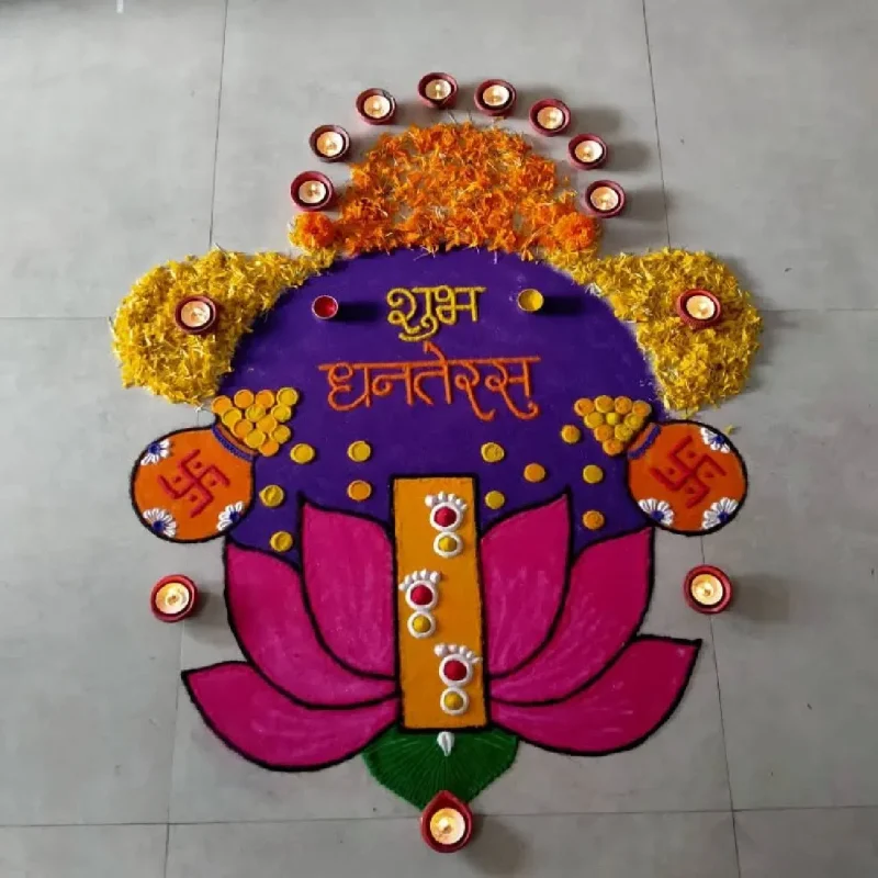 अगर आप सिंपल और आकर्षक रंगोली बनाना चाहते हैं, तो एक सर्कल बनाकर उसके अंदर अलग-अलग रंगों से “शुभ धनतेरस” लिख सकते हैं। इसके चारों ओर फूल और दीयों का डिज़ाइन बनाएं। कमल का फूल और कलश का चित्र इसे और सुंदर बनाता है।