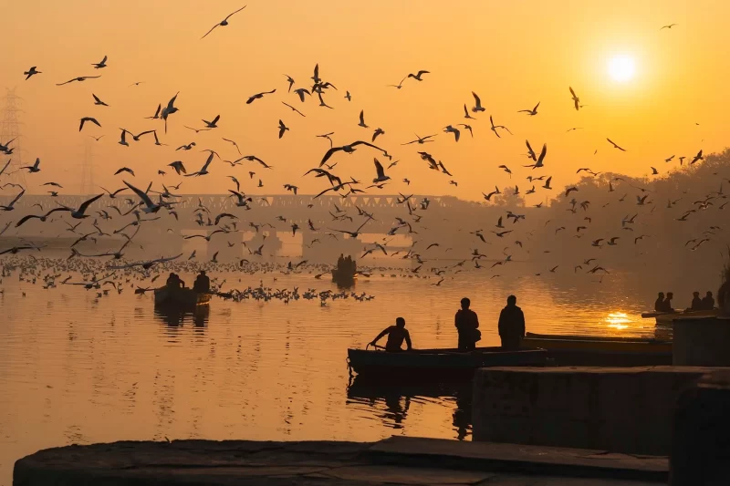सुबह के समय यमुना घाट का नजारा दिल जीत लेता है। शांत पानी पर पड़ती सुनहरी किरणें और उड़ते हुए सैकड़ों सीगल्स फोटोग्राफी के लिए एक ड्रीमी बैकग्राउंड तैयार करते हैं।