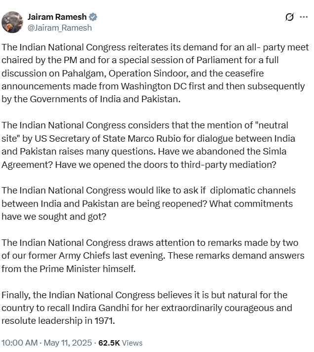 कांग्रेसी नेता जयराम नरेश ने सोशल मीडिया प्लेटफार्म एक्स पर पोस्ट करते हुए कहा कि कांग्रेस प्रधानमंत्री (नरेंद्र मोदी) की अगुवाई में सर्वदलीय बैठक की मांग करती है। साथ में पार्टी पहलगाम आतंकी हमला, ऑपरेशन सिंदूर और सीजफायर को लेकर पहले वाशिंगटन डीसी फिर उसके बाद भारत और पाकिस्तान की सरकारों की ओर से की गई युद्ध विराम घोषणाओं पर पूर्ण चर्चा के लिए संसद का विशेष सत्र बुलाए जाने की मांग भी दोहराती है। उन्होंने अपने पोस्ट में आगे कहा कि कांग्रेस का यह भी मानना ​​है कि भारत और पाकिस्तान के बीच बातचीत के लिए अमेरिकी विदेश मंत्री मार्को रुबियो की ओर से किसी तटस्थ स्थल का जिक्र करना कई सवाल खड़े करता है। क्या अब हमने शिमला समझौते को छोड़ दिया है? क्या हमने अब तीसरे पक्ष की मध्यस्थता के लिए अपने दरवाजे खोल दिए हैं? कांग्रेस कल शाम हमारे देश के 2 पूर्व सेना प्रमुखों की ओर से की गई टिप्पणियों की ओर ध्यान आकर्षित करती है। इन टिप्पणियों का जवाब खुद पीएम मोदी से मांगा जाना चाहिए। वह आगे कहते हैं कि अंत में, कांग्रेस का मानना ​​है कि देश के लिए 1971 में असाधारण साहसी और दृढ़ नेतृत्व के लिए इंदिरा गांधी को याद करना स्वाभाविक भी है।