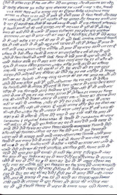 आज मैं कचहरी परिसर में आत्महत्या करने जा रहा हूं। क्योंकि इतनी बंदिशों और बेइज्जती के साथ मैं और नहीं जी सकता, मैं जा रहा हूं। मां बाप की 25वीं वर्षगांठ के लिए मैंने अपनी क्षमतानुसार चांदी की अंगूठी गिफ्ट में देने की बात घर पर बताई थी। परंतु कुछ बात ऐसे बेटे को डिजर्व नहीं करते. सभी मां बाप से अपील है कि बच्चों पर उतनी ही सख्ती बरतें जितना वो बर्दाश्त कर सके। मेरा निवेदन है कि मेरी लाश को मेरे पापा छू भी ना पाएं. मैं उनपर कोई और कार्रवाई नहीं चाहता हूं। ताकि मेरा परिवार बर्बाद न हो। भगवान करे ऐसे पिता किसी को ना मिलें। अगर किसी को लगता है कि मैं झूठा हूं तो मेरी मां-बहन और पड़ोसियों से मेरे बारे में पूछ लेना। मेरे सारे एफर्ट्स भविष्य में कुछ बनने के सपने सब खत्म हो गए। मैं हार गया, पापा जीत गए, उनको मुबारक।