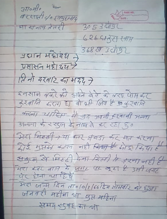 पुलिस को घटनास्थल से एक सुसाइड नोट बरामद हुआ है, जिसमें युवक ने लिखा “लोग अल्लाह की राह में बकरे की कुर्बानी देते हैं, मैं खुदा की राह में अपनी कुर्बानी दे रहा हूं।” बताया जा रहा है कि युवक एक दिन पूर्व ही किछौछा शरीफ स्थित सुल्तान सैयद मखदूम अशरफ जहांगीर सिमनानी की दरगाह से लौटा था। फिलहाल पुलिस मामले की जांच पड़ताल में जुट गई है। सुसाइड नोट को भी फोरेंसिक जांच के लिए भेजा गया है। इस हृदयविदारक घटना से क्षेत्र में शोक और स्तब्धता का माहौल है।