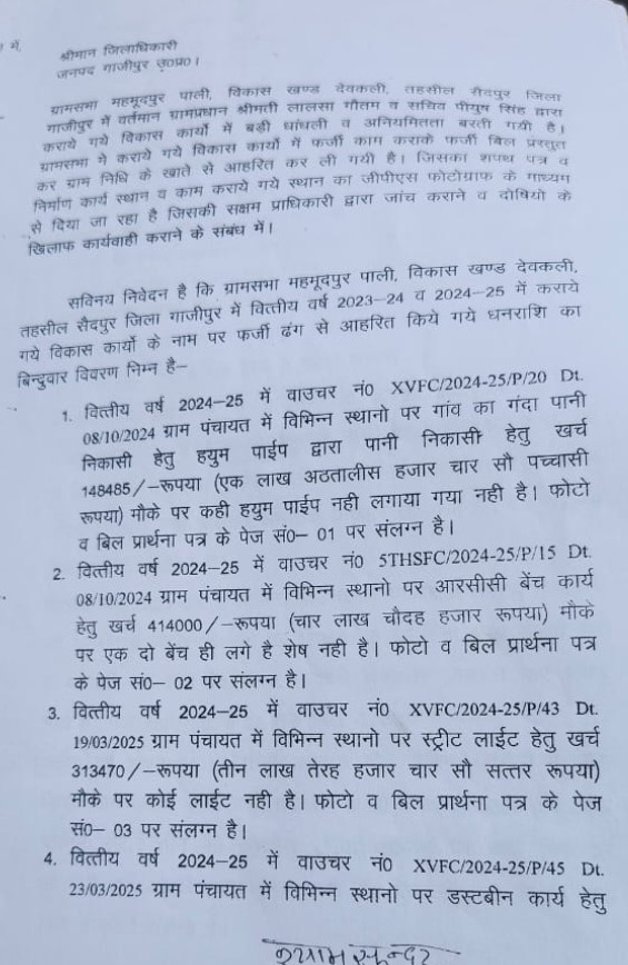 डिजिटल डेस्क- गाजीपुर में विकासखंड देवकली की ग्रामसभा महमूदपुर पाली में ग्राम विकास योजनाओं में भारी भ्रष्टाचार का मामला उजागर हुआ है। गांव के लोगों ने जिलाधिकारी को ज्ञापन सौंपकर ग्राम प्रधान व सचिव पर फर्जी भुगतान के जरिए करीब ₹39 लाख के गबन का आरोप लगाया है। शिकायतकर्ता श्याम सुंदर के अनुसार, ग्राम प्रधान लालसा गौतम और सचिव पीयूष सिंह द्वारा विभिन्न योजनाओं में बिना कार्य कराए ही सरकारी धन का बंदरबांट कर लिया गया।