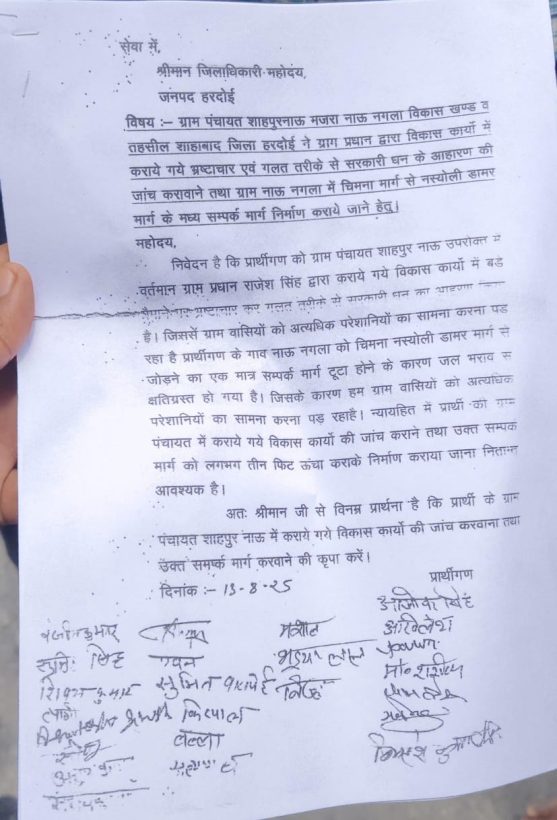 लगभग दो दर्जन ग्रामीणों ने जिलाधिकारी हरदोई अनुनय झा के कार्यालय पर पहुंचकर ग्राम प्रधान राजेश सिंह के द्वारा करवाए गए विकास कार्यों को लेकर जांच करके आवश्यक कार्रवाई करने की गुहार लगाई हुई है। हरदोई की शाहाबाद विकासखंड क्षेत्र की ग्राम सभा शाहपुरनाउ के ग्राम प्रधान राजेश सिंह के द्वारा ग्राम सभा में करवाए गए कार्यों के तहत जमकर भ्रष्टाचार किया गया है। ग्रामीणों ने अपने ही ग्राम प्रधान पर आरोप लगाते हुए कहा हुआ है कि ग्राम प्रधान के द्वारा नाली, खड़ंजा, आवास, शौचालय आदि का मनरेगा के तहत जमकर भ्रष्टाचार किया जा रहा है।