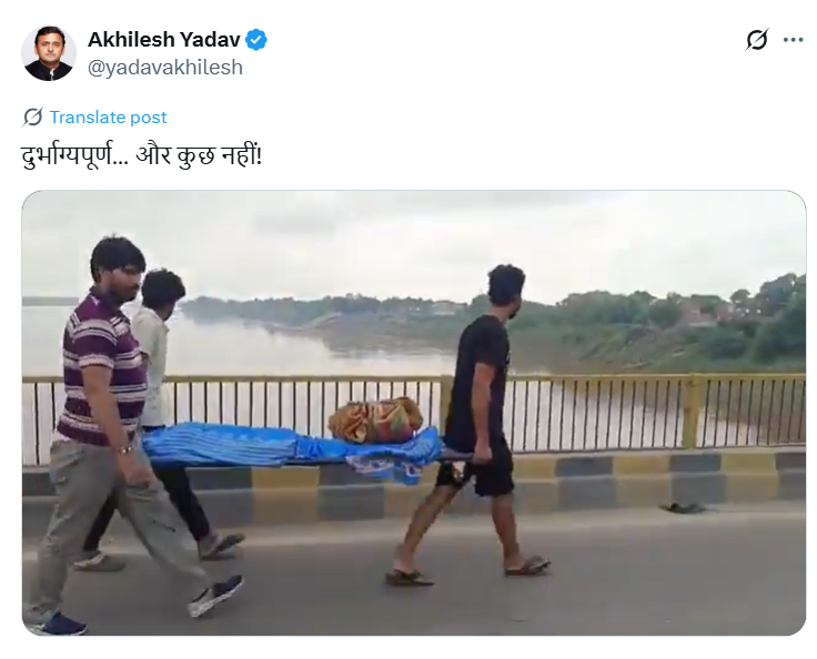 सिद्धार्थ द्विवेदी- यूपी के हमीरपुर जिले से बीते शनिवार को मानवता को शर्मसार करने वाला एक वीडियो सोशल मीडिया पर वायरल हुआ था, जिसमें मरम्मत कारणों के चलते पुल बंद होने के कारण एक लाचार बेटा अपनी मां के शव को स्ट्रेचर पर रखकर एम्बुलेंस कर्मी की मदद पैदल पुल पार करते हुए नजर आया था। साथ ही उसी दिन सदर विधायक मनोज प्रजापति की कार का पुल से गुजरने का भी वीडियो सोशल मीडिया पर वायरल हुआ था। जिसके बाद लोग दोनों मामलों को जोड़कर आम आदमी और वीआईपी पर्सन के लिए अलग नियम कानून होने का हवाला देते हुए व्यवस्थाओं पर सवाल खड़े कर रहे थे, वहीं देखते ही देखते मामले में राजनीति गरमाने लगी और एक के बाद एक पार्टियों ने अपने ट्वीटर हैंडल से मामले को शर्मनाक बताते हुए पोस्ट करना शुरू कर दिया। समाजवादी पार्टी ने अपने ट्विटर हैंडल से भाजपा सरकार पर निशाना साधा तो वहीं कांग्रेस ने भी ट्वीट कर भाजपा सरकार को कटघरे में खड़ा कर दिया, जिसके बाद आज अखिलेश यादव समाजवादी पार्टी अध्यक्ष ने अपने पर्सनल ट्विटर हैंडल अकाउंट से घटना की एक फोटो शेयर करते हुए घटना को शर्मनाक बताया।