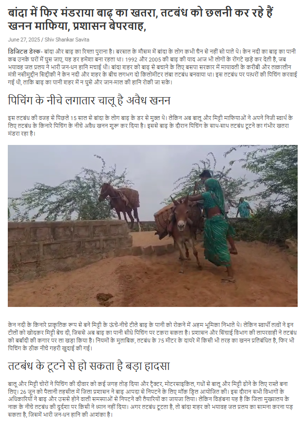 आपको बता दें कि बसपा सरकार में मंत्री रहे नसीमुद्दीन सिद्दीकी ने बांदा शहर और केन नदी के किनारे तटबंध बनाकर पत्थर की पिचिंग कराई गई थी। जिसके बाद बांदा शहर पूरी तरह बाढ़ से सुरक्षित हो गया था, लेकिन सिंचाई विभाग की उदासीनता और मिट्टी व बालू चोरों के द्वारा तटबंध की मिट्टी खोदने से एक बार फिर तटबंध टूटने की कगार पर पहुंच गया है। जगह-जगह तटबंध टूट गया है, कहीं-कहीं पिचिंग से पत्थर तक उखाड़ दिए गए । पिछले दिनों जिला अधिकारी बांदा जे रिभा ने तटबंध का निरीक्षण कर सिंचाई विभाग को तत्काल तटबंध की मरम्मत करने का निर्देश दिया गया था, लेकिन सिंचाई विभाग के ठेकेदार द्वारा तटबंध के अंदर की ही मिट्टी खोदकर तटबंध मे डाल कर महज खानापूर्ति कर अधिकारी व ठेकेदार ने सरकारी पैसे को हजम कर गए।