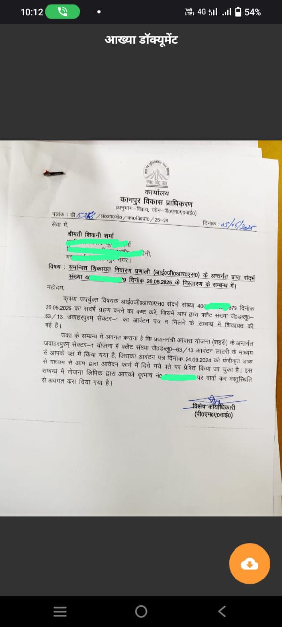 कानपुर के पीडब्ल्यूडी कालोनी में रहने वाली शिवानी शर्मी ने प्रधानमंत्री आवास योजना के तहत वर्ष 2023 में आवेदन किया था। कानपुर विकास प्राधिकरण द्वारा लॉटरी के माध्यम से शिवानी को जवाहर पुरम सेक्टर-1 में फ्लैट संख्या JW-63/13 आवंटित कर दिया था। नवंबर 2024 में शिवानी को फोन कॉल के माध्यम से आवंटन पत्र प्राप्त करने के लिए कानपुर विकास प्राधिकरण बुलाया गया था परन्तु स्वास्थ्य सही न होने के कारण शिवानी शर्मा अपना आवंटन पत्र लेने नहीं जा सकी। जब स्वास्थ्य पूर्ण रूप से सही हो गया, तब शिवानी कानपुर विकास प्राधिकरण जाकर अपना आवंटन पत्र लेने गई, जहां उन्हे डाक द्वारा आवंटन पत्र भेजे जाने की जानकारी दी गई। शिवानी शर्मा ने बताया कि उनके पास डाक द्वारा आवंटन पत्र नहीं लिया गया है और न ही कोई पोस्टमैन आवंटन पत्र लेकर आया है। शिवानी शर्मा ने बताया कि उनके द्वारा कोई डाक से आवंटन पत्र नहीं लिया गया है। ऐसे में अगर प्राधिकरण द्वारा भेजा गया पत्र प्रार्थी के पास नहीं पहुंचता है तो आवंटन पत्र वापस भेजने वाले (कानपुर विकास प्राधिकरण) के पास जाता है। ऐसे में कानपुर विकास प्राधिकरण के अधिकारी आवंटन पत्र नहीं दे रहे हैं और विगत 5 महीनों से टरका रहे हैं।