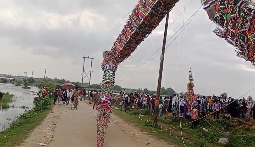 डिजिटल डेस्क- लखीमपुर खीरी के बनवारीपुर में आयोजित ताजिया मेले में रविवार शाम एक बड़ा हादसा टल गया। सदर कोतवाली क्षेत्र के कर्बला मैदान में शाम 5:30 बजे का यह वाकया है। बलूडीहा गांव का 170 फीट लंबा ताजिया जब उठाया जा रहा था, तब संतुलन बिगड़ने से वह पलट गया। ताजिया हाईटेंशन बिजली लाइन पर जा गिरा। हादसे के समय बिजली आपूर्ति बंद होने से कोई जनहानि नहीं हुई। ताजिया के गिरते ही मेले में अफरा-तफरी मच गई। मौके पर तैनात पुलिस बल ने तुरंत स्थिति को काबू में किया। भीड़ को नियंत्रित कर लिया गया।
