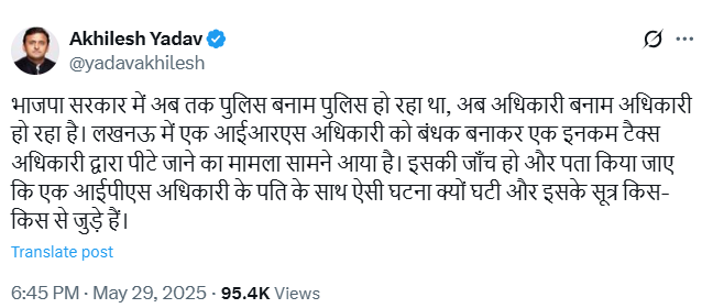 सोशल मीडिया प्लेटफार्म एक्स पर पोस्ट करते हुए लिखा कि भाजपा सरकार में अब तक पुलिस बनाम पुलिस हो रहा था, अब अधिकारी बनाम अधिकारी हो रहा है। लखनऊ में एक आईआरएस अधिकारी को बंधक बनाकर एक इनकम टैक्स अधिकारी द्वारा पीटे जाने का मामला सामने आया है। इसकी जाँच हो और पता किया जाए कि एक आईपीएस अधिकारी के पति के साथ ऐसी घटना क्यों घटी और इसके सूत्र किस-किस से जुड़े हैं।