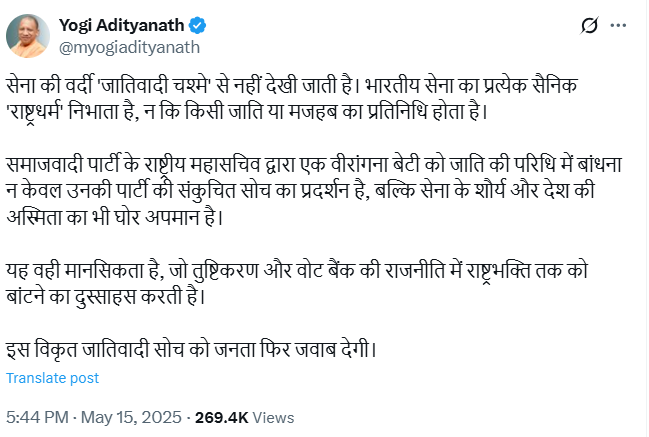 मुख्यमंत्री योगी आदित्यनाथ ने सोशल मीडिया साइट एक्स पर पोस्ट करते हुए लिखा कि सेना की वर्दी ‘जातिवादी चश्मे’ से नहीं देखी जाती है। भारतीय सेना का प्रत्येक सैनिक ‘राष्ट्रधर्म’ निभाता है, न कि किसी जाति या मजहब का प्रतिनिधि होता है। समाजवादी पार्टी के राष्ट्रीय महासचिव द्वारा एक वीरांगना बेटी को जाति की परिधि में बांधना न केवल उनकी पार्टी की संकुचित सोच का प्रदर्शन है, बल्कि सेना के शौर्य और देश की अस्मिता का भी घोर अपमान है। यह वही मानसिकता है, जो तुष्टिकरण और वोट बैंक की राजनीति में राष्ट्रभक्ति तक को बांटने का दुस्साहस करती है। इस विकृत जातिवादी सोच को जनता फिर जवाब देगी।